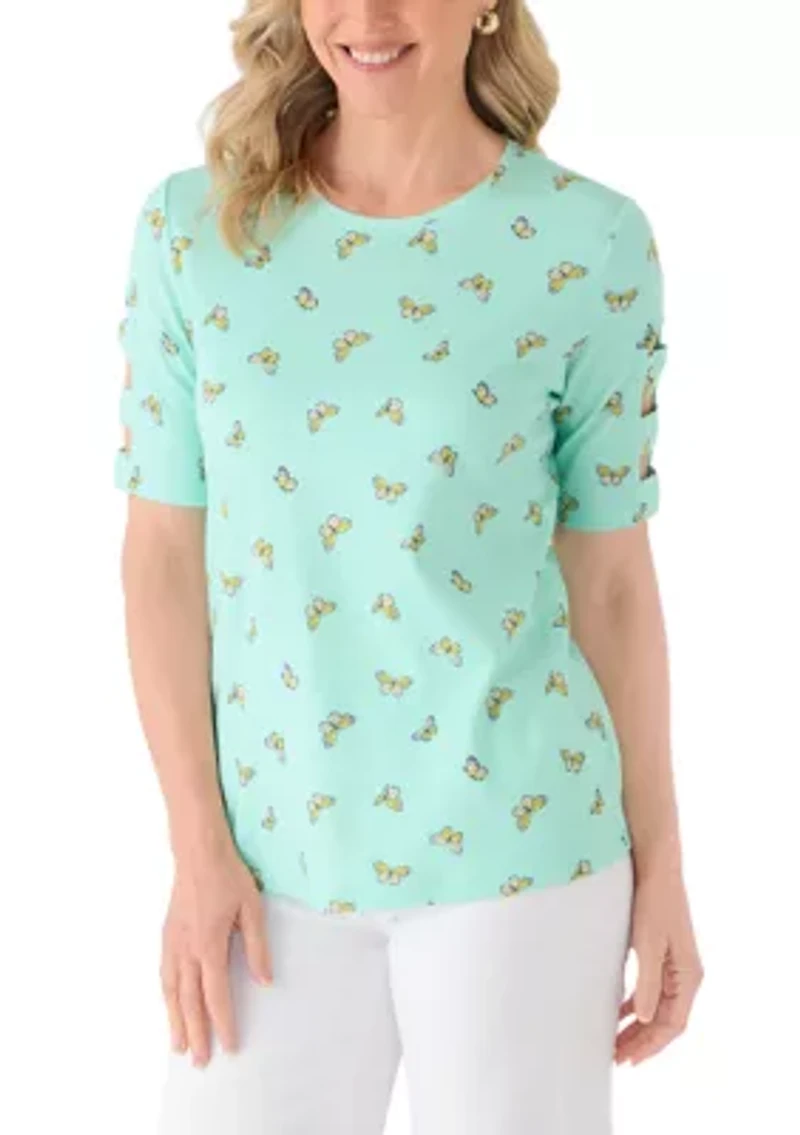 This Kim Rogers® shirt features a sweet pattern that adds a pop of color to your wardrobe. Pullover Crew neck Elbow sleeves Imported Belk Exclusive Product Specifications 26" L Material & Care 100% cotton Machine washable