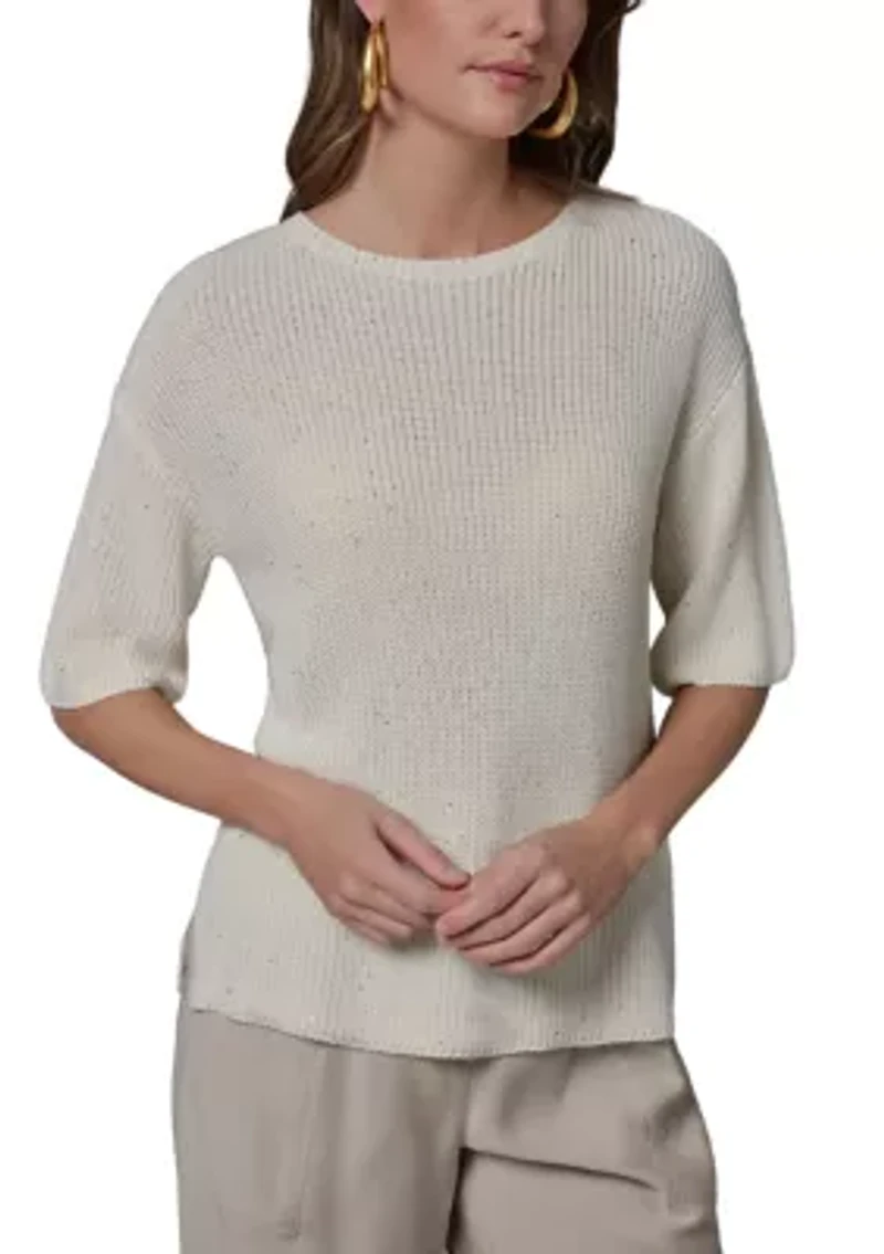 This Donna Karan New York sweater is perfect for any occasion, with relaxed drop-shoulder sleeves for a chic look all day long. Pullover Crew neck Short drop shoulder sleeves Imported Product Specifications 22" L Material & Care Viscose, rayon, nylon Machine washable