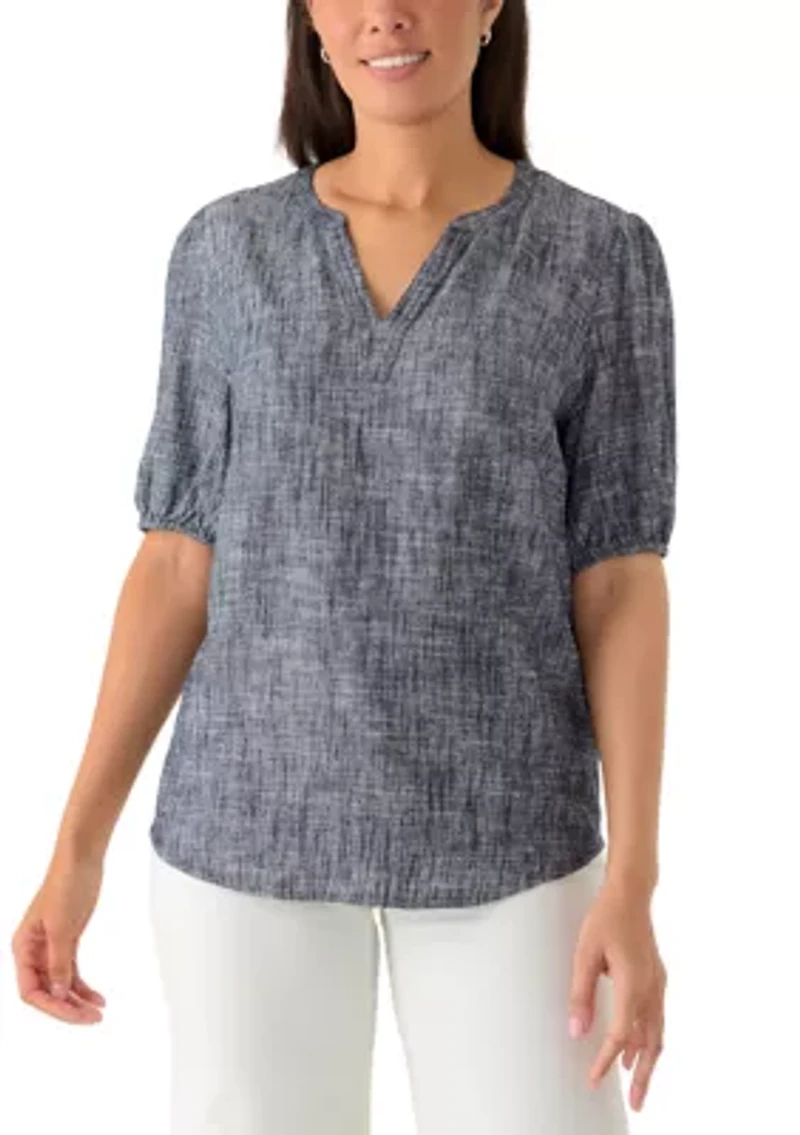 This Kim Rogers® top is perfect for any occasion, featuring charming elbow sleeves and a stylish split neck for a chic look all day long. Pullover Split neck Elbow sleeves Imported Belk Exclusive Product Specifications 28" L Material & Care Rayon, linen Machine washable