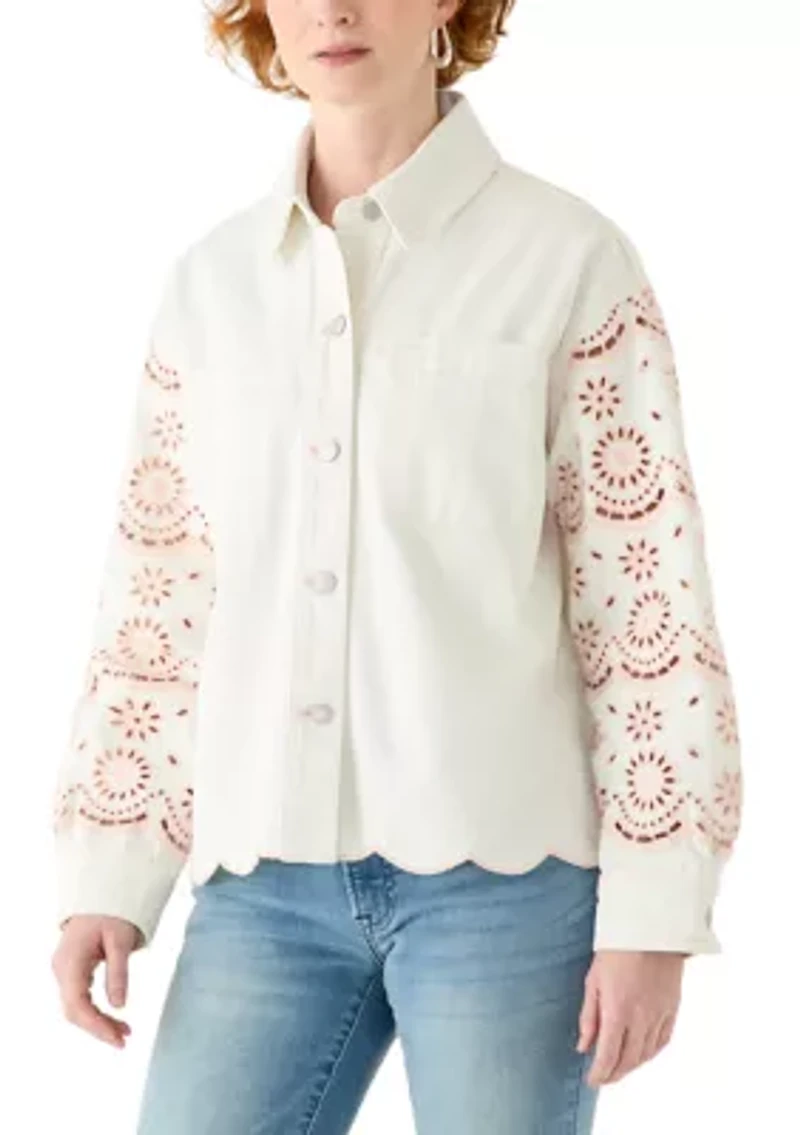 Stay chic and fashionable with this Wonderly jacket, featuring charming eyelet designs along the sleeves and breathable fabric for all-day wear and comfort. Button closure Collar Long set-in sleeves Unlined Imported Belk Exclusive Product Specifications 25" L Material & Care 100% cotton Machine washable