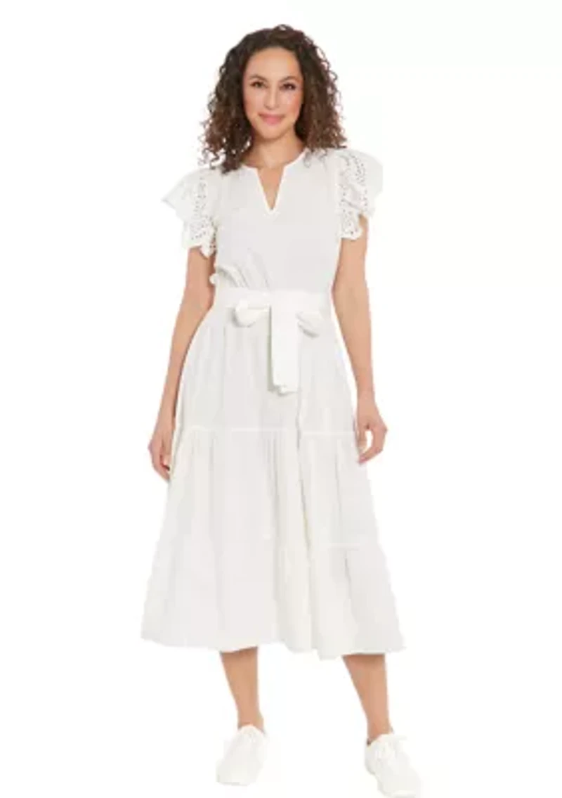 This charming midi dress exudes effortless style with its pullover design and falls gracefully to a flattering length. Crafted from 100% cotton, it ensures breathable comfort all day long. The V-neckline adds a touch of elegance, while the flutter sleeves with delicate eyelet detailing elevate its charm. Perfect for casual occasions, this dress is a versatile addition to your wardrobe, effortlessly transitioning from day to evening wear. Pullover V-neck Short flutter sleeves Lined Imported Product Specifications 47.5" L Material & Care Cotton Machine washable