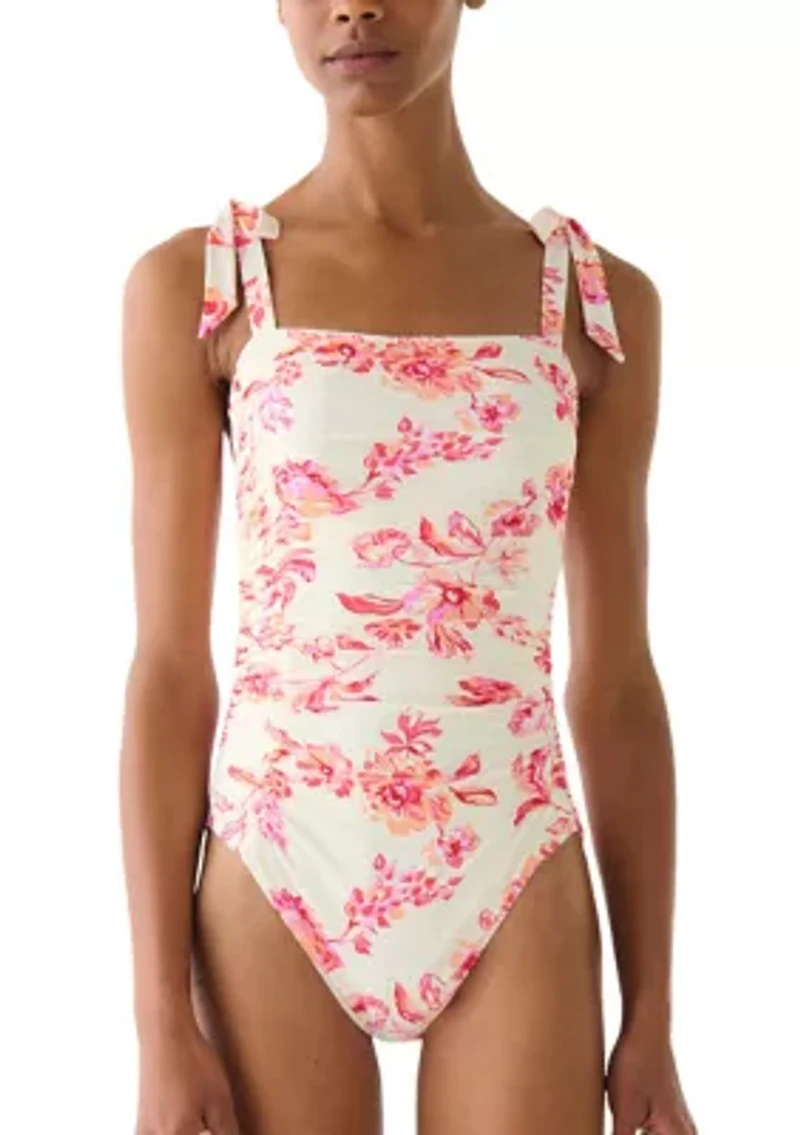 Women's Floral Toile Bow Shoulder Shirred One Piece Swimsuit