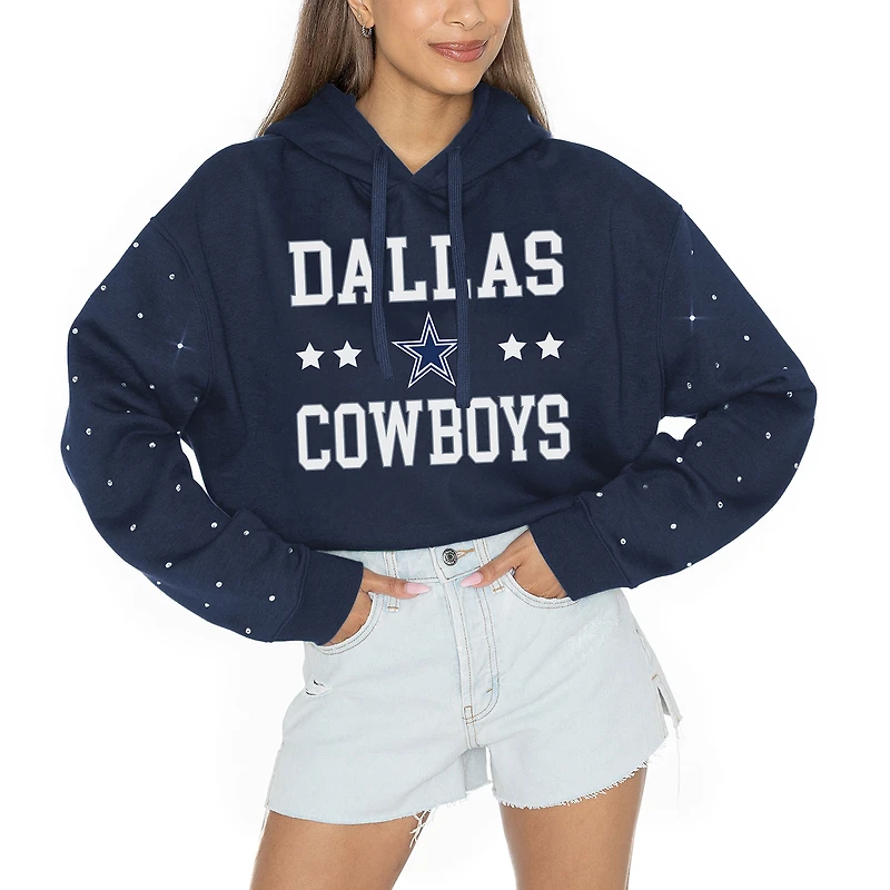 Shine bright on game day with this Dallas Cowboys Like A Star Scrunch Waist Pullover Rhinestone Hoodie from Gameday Couture. This stylish hoodie features a trendy scrunch waistband and dropped shoulder seams, ensuring a flattering and comfortable fit. Rhinestone details on the sleeves add a touch of sparkle, making it perfect for showcasing your Dallas Cowboys spirit in style.