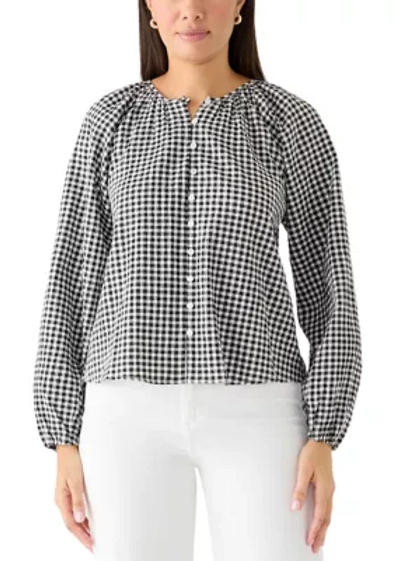 This Sanctuary blouse is perfect for any occasion, featuring charming raglan sleeves and a stylish gingham print for a chic look all day long. Button closure Split neck Long raglan sleeves Imported Product Specifications 23.25" L Material & Care Cotton, polyester, spandex Machine washable