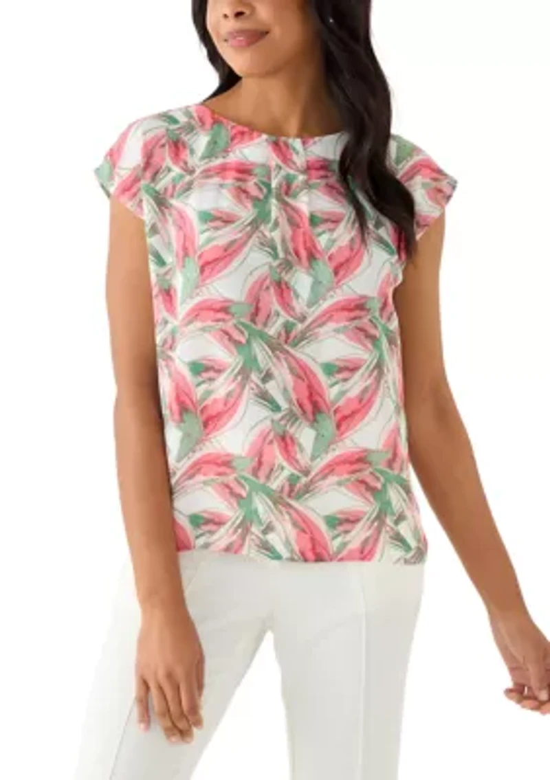 This versatile blouse is crafted from 100% breathable polyester, ensuring the utmost comfort and ease of wear. Its relaxed pullover design and unlined construction provide a comfortable fit, perfect for casual outings or lounging at home. The crew neckline and cap sleeves add a touch of classic elegance, while the vibrant leaf print adds a playful pop of color to your wardrobe. Pullover Crew neck Short cap sleeves Unlined Imported Belk Exclusive Product Specifications 23.5" L Material & Care Polyester Machine washable