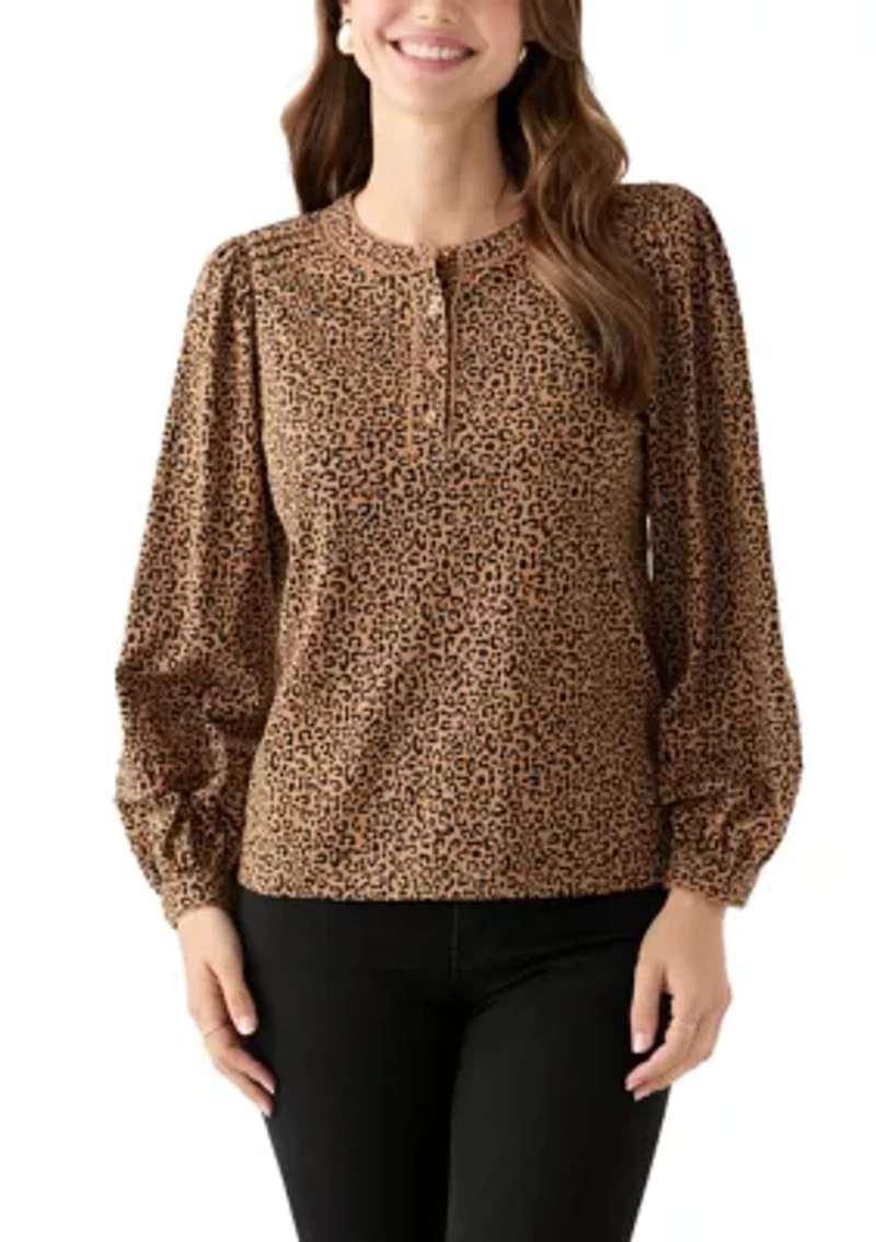 Women's Long Sleeve Pintuck Henley Print Blouse