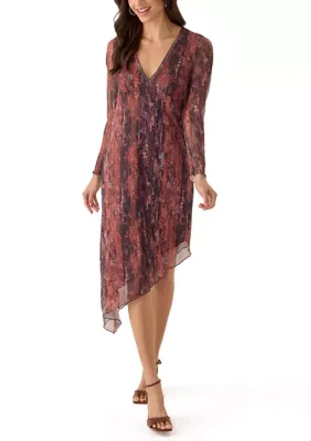 SIENA Long Sleeve V-Neck Printed Shimmer Asymmetrical Knee Length Dress