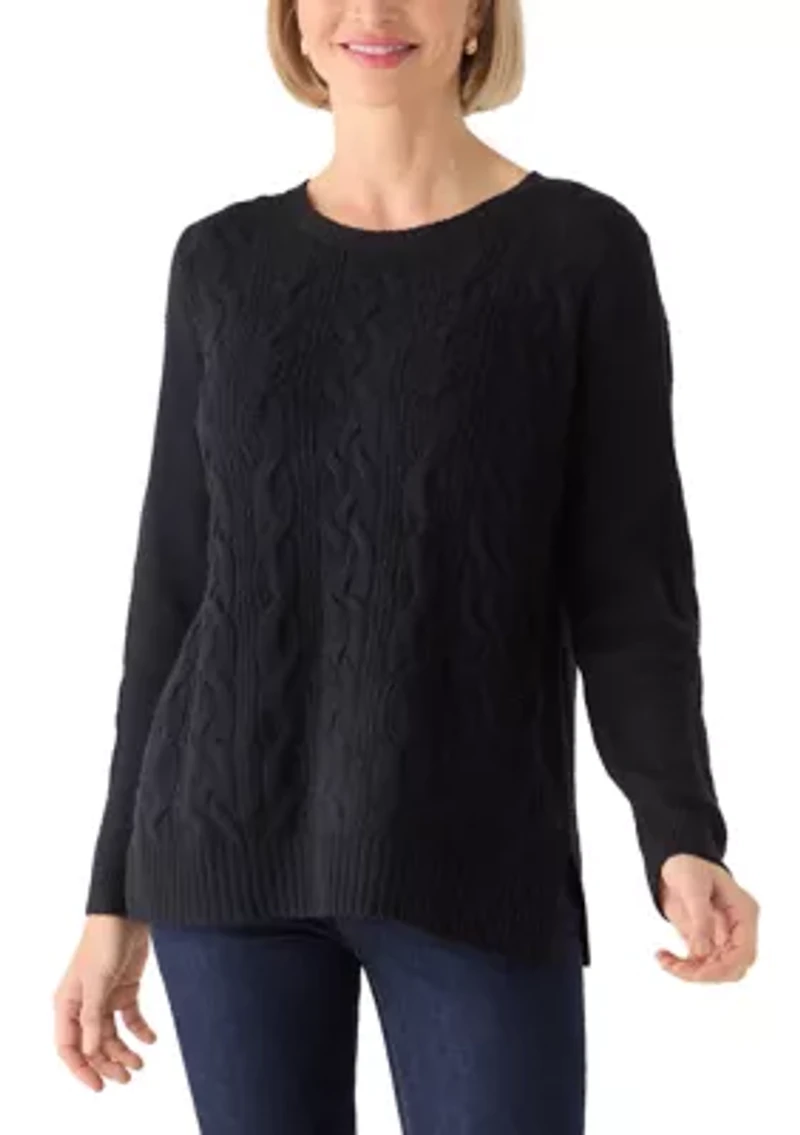 Classic cables get a modern twist in this directional knit sweater, from Ruby Rd complete with a stretchy feel, soft crew neck and long sleeves. The textured design adds depth and charm to your cold-weather layers. Pullover Scoop neck Long sleeves Unlined Imported Product Specifications 25" L Material & Care Nylon, polyester Hand wash