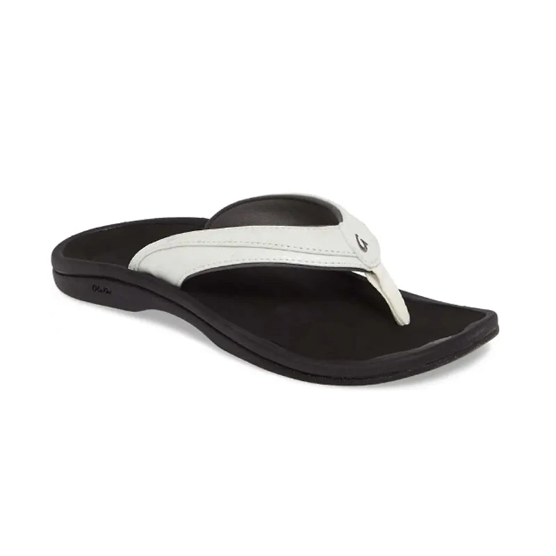 Women's Olukai ‘Ohana - White/Black ‘Ohana (family) is the cornerstone of Hawaiian culture. Family celebrations often include tutu, aunties, uncles, cousins, and close friends that you have grown up with. We crafted our classic style with that in mind. Water-resistant with a smooth footbed, it's the kind of sandal that your entire ‘ohana can wear comfortably. DETAILS: UPPER: Water-resistant synthetic or metallic synthetic straps with quick-drying jersey knit lining and soft nylon toe post create an ultra-comfy fit. Solid or split strap options. FOOTBED: The compression-molded EVA midsole with a smooth drop-in ICEVA footbed provides an anatomical fit for all-day comfort. OUTSOLE: Non-marking rubber outsole with razor-siped edges enhances traction on wet surfaces.
