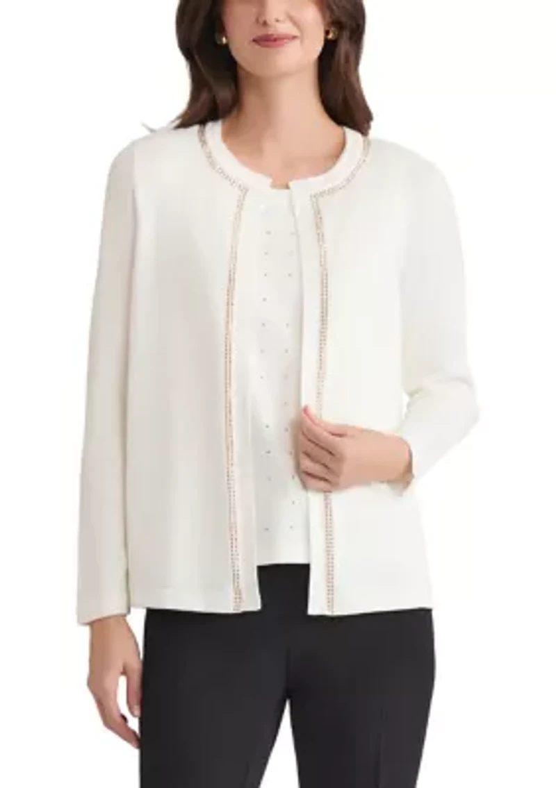 Layer on effortless elegance with this open-front Kasper cardigan. Designed for comfort and versatility, it’s finished with a sparkling heat-set trim that adds just the right touch of shine to elevate your everyday style. Pullover Crew neck Long sleeves Imported Product Specifications 23.38" L Material & Care Viscose, nylon Hand wash