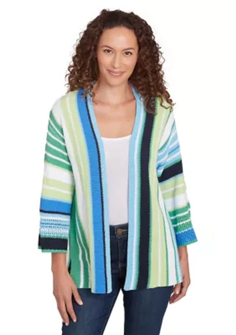 This cardigan will become your favorite. Its vertical stripes boast beautifully complemented colors, while the flattering details of the three-quarter sleeves and flowy open front will make you fall in love. Crafted from a soft cotton blend, this cardigan ensures both comfort and style. Pair it with your favorite jeans or dress for a chic and cozy look. Pullover Shawl collar 3/4 sleeves Unlined Imported Product Specifications 25.5" L Material & Care Cotton blend Hand wash