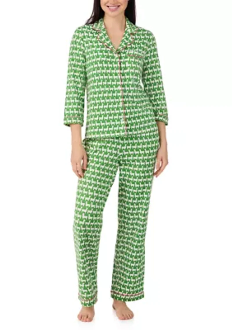 Experience ultimate comfort with this kate spade new york® two-piece pajama set. The three-quarter sleeve top pairs effortlessly with full-length pants, both adorned in fun patterns. 2-piece set Top: button closure, collar, three-quarter drop shoulder sleeves Bottom: long pant Imported Product Specifications 30.5" inseam Material & Care 94% recycled polyester, 6% spandex Machine washable