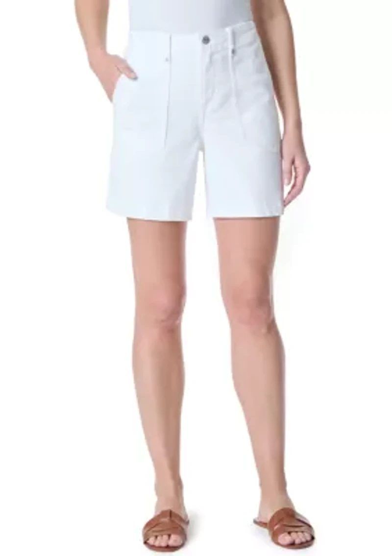 This versatile pair of women's shorts is crafted from a soft and breathable cotton-polyester-spandex blend, ensuring utmost comfort during any activity. Designed with a high-rise waist and straight leg cut, these shorts provide a flattering and relaxed fit. Functional details include belt loops, a button zipper closure, two front slant pockets, and two back patch pockets, offering ample storage space for your essentials. Available in a range of colors, these shorts are a must-have addition to your casual wardrobe. Zip closure Straight leg Imported Product Specifications 7" Inseam Material & Care Cotton, polyester, spandex Machine washable
