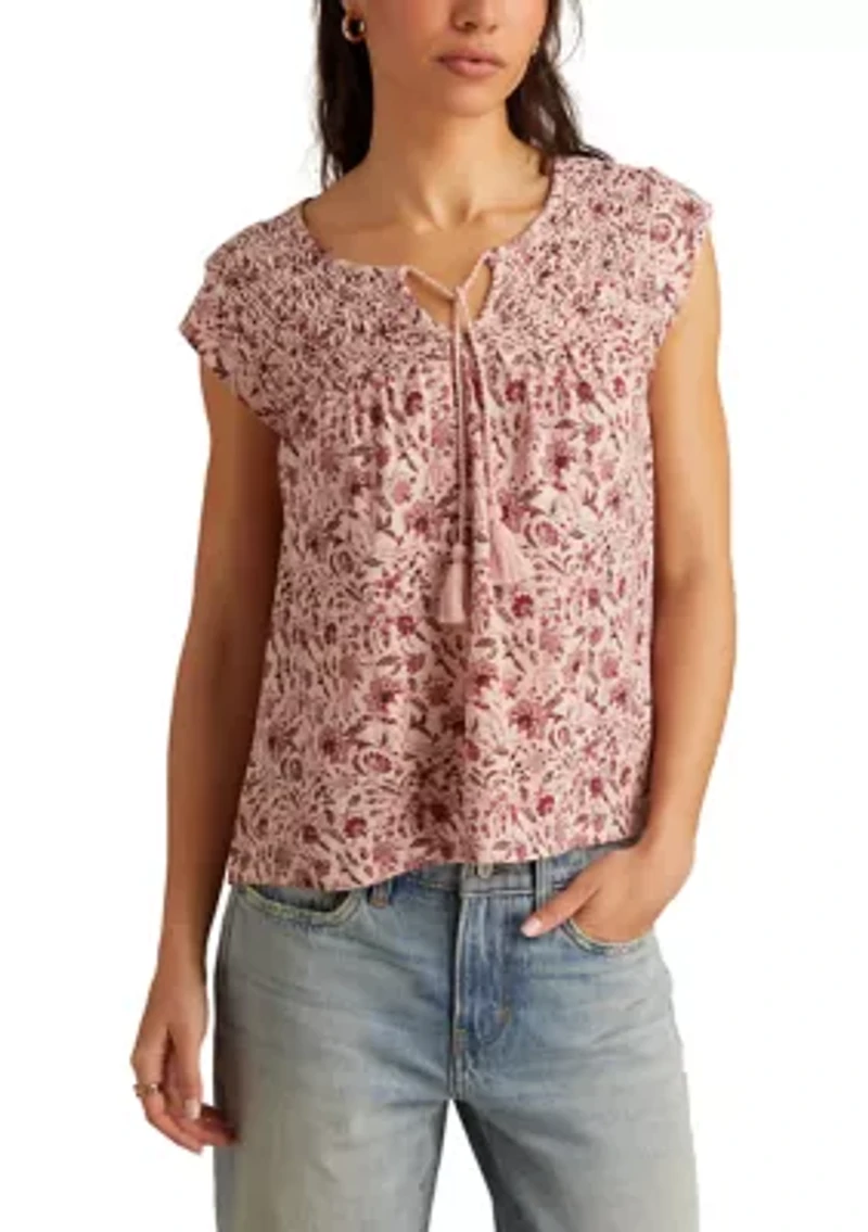 Lovely prints and vibrant colors highlight the feminine allure of this tie-neck t-shirt from Lucky Brand. Pullover Tie neck Short cap sleeves Unlined Imported Product Specifications 25" L Material & Care 100% Cotton Machine washable