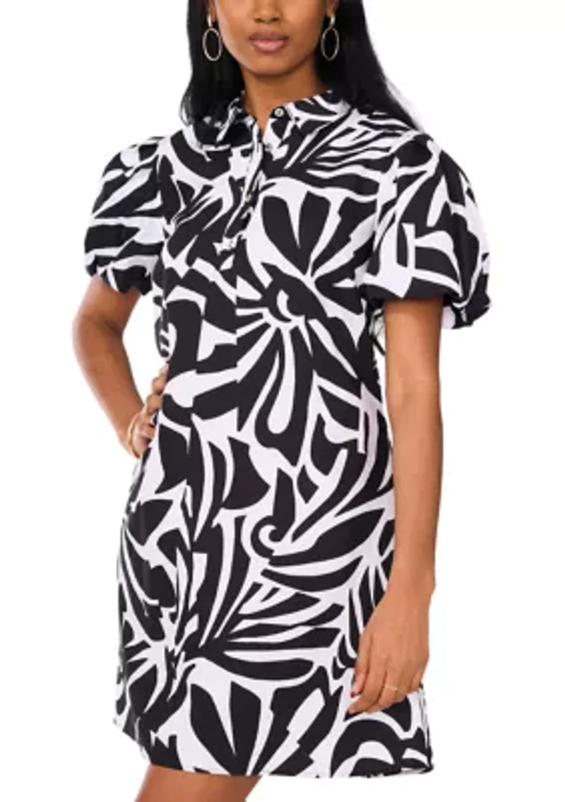 An alluring black and white print adds eye-catching appeal to this chic dress from MSK. Button closure Collar Short puff sleeves Unlined Imported Product Specifications 35" L Material & Care Cotton Machine washable