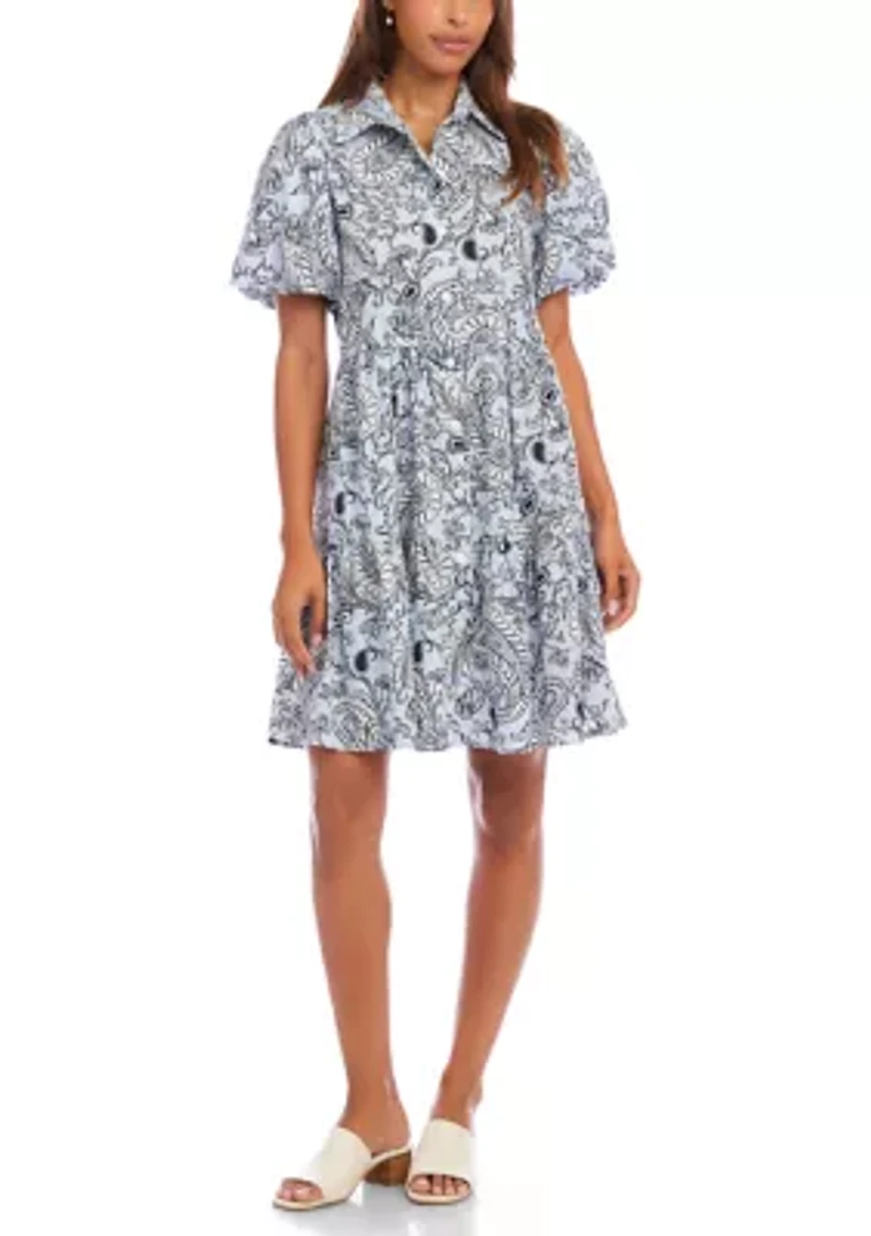 Fresh and easy to wear, this Karen Kane puff sleeve tiered shirtdress is crafted from swirling paisley cotton poplin for a lightweight, breathable feel with a crisp finish. Designed with a classic collared neckline and button-front closure, it features softly structured puff sleeves and a tiered skirt that adds movement and shape. Finished with an above-the-knee length, this versatile dress is perfect for warm-weather days and effortless styling. Button closure Collared neck Short puff sleeves Unlined Imported Product Specifications 37.25" L (Size M) Material & Care 100% cotton Hand wash