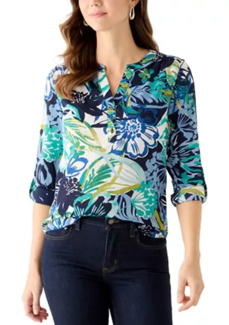 Women's Rolled Sleeve Printed Henley Shirt