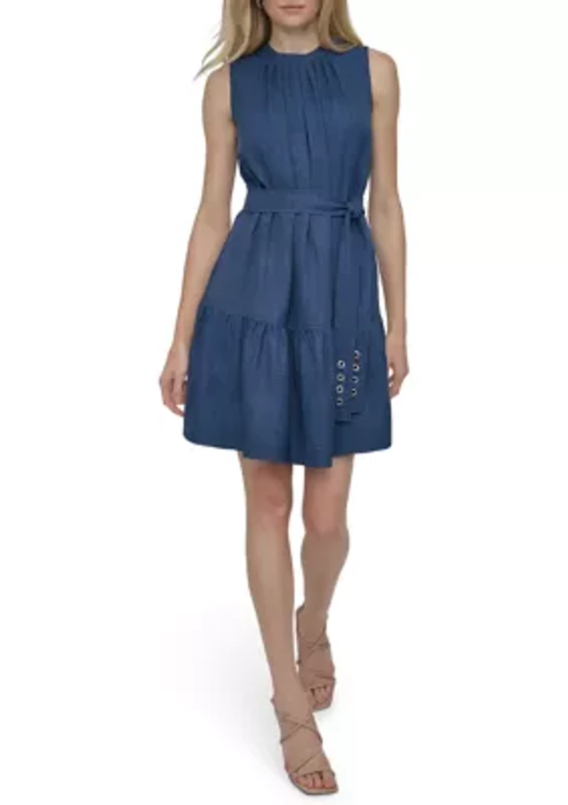 Chic ruffled tiers and a belted waist add to the feminine allure of this lovely A-line dress from DKNY. Tie closure Crew neck Sleeveless Unlined Imported Product Specifications 36.5" L Material & Care 100% Polyester Dry clean only