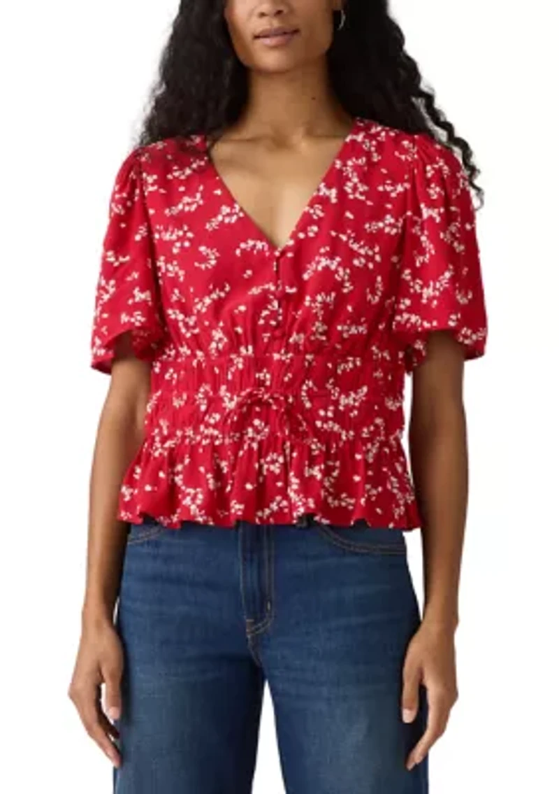 This elegant blouse from Levi's® offers a flattering V-neck and short sleeves, perfect for warm weather. Button closure V-neck Short sleeves Unlined Imported Product Specifications 20" L Material & Care 100% viscose (ECOVERO™) Machine washable