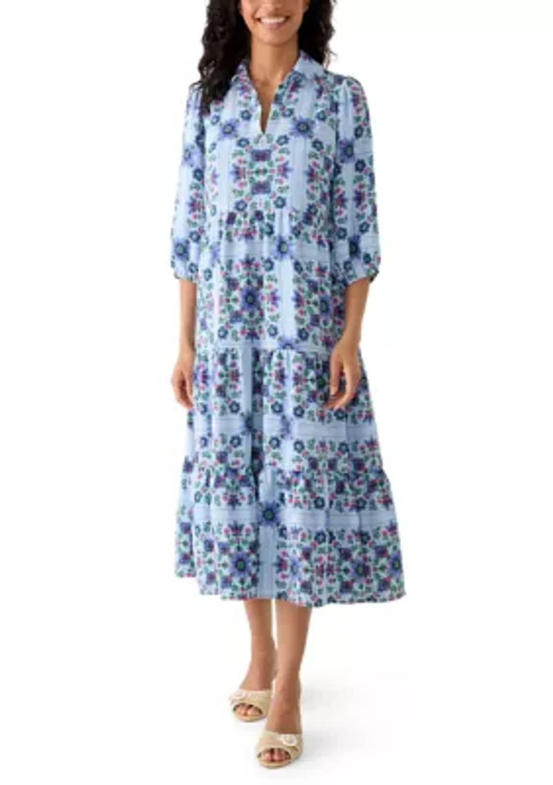 This Sandra Darren short sleeve floral midi shirtdress combines a classic collared design with a feminine floral print for effortless style. Pullover Collared neck Three-quarter blouson sleeves Unlined Imported Product Specifications 48.75" L Material & Care 100% polyester Machine washable