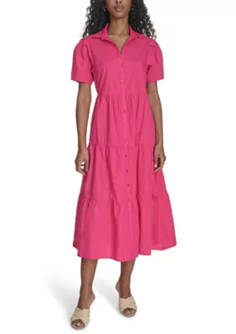This lovely Calvin Klein shirtdress, with its charming A-line style and tiered design, offers a chic look that's perfect for all-day wear. Button closure Collar Short sleeves Unlined Imported Product Specifications 48" L Material & Care 100% cotton Machine washable