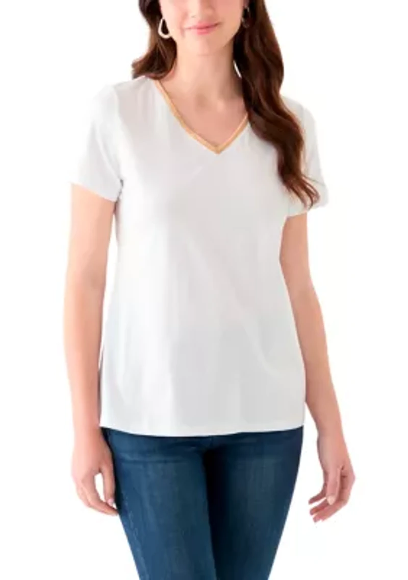 Refresh your everyday assortment with this V-neck t-shirt from Kim Rogers®. Crafted in soft cotton, this tee keeps you cool and comfortable all day long. Pullover V-neck Short sleeves Imported Belk Exclusive Product Specifications 26.5" L Material & Care 100% Cotton Machine washable