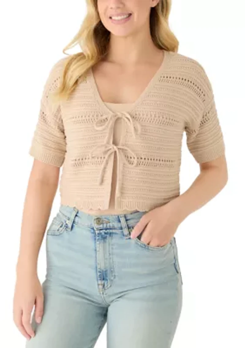 This Pink Rose cardigan is a lightweight layering piece with a flattering V‑neckline and two front ties for a chic, adjustable fit. Its short sleeves make it perfect for warm weather styling, while the tie‑front detail adds a touch of modern charm. Tie closure V-neck Short drop shoulder sleeves Unlined Imported Product Specifications 17" L Material & Care Polyester, rayon, nylon Hand wash