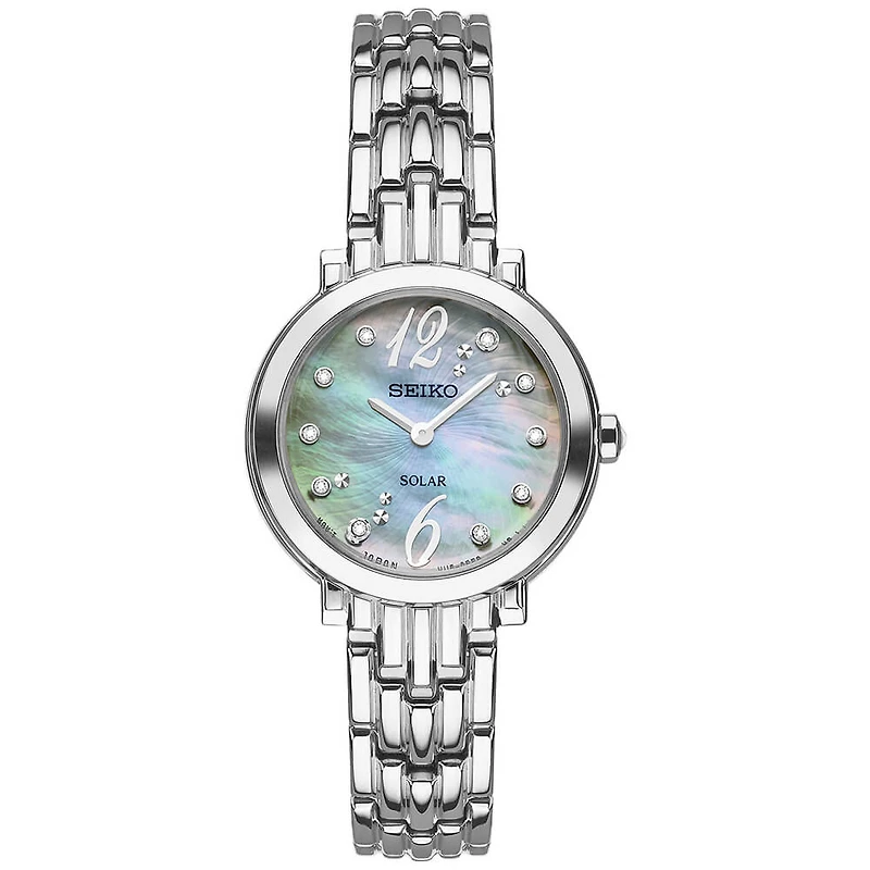 In stainless steel with silver-tone finish, mother-of-pearl dial, 10 diamonds, 12 month power reserve, water resistant up to 30M and fold over push button clasp.