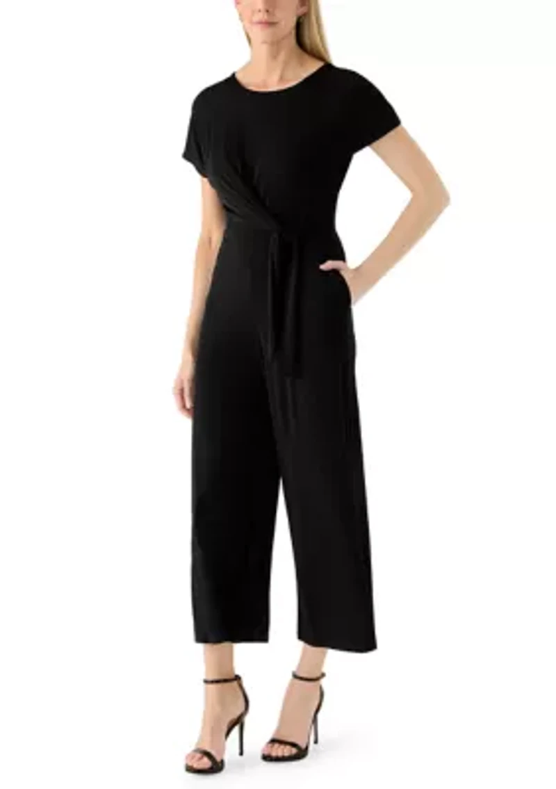 This Robbie Bee jumpsuit features a printed mesh design with an A-line silhouette for a modern, airy look. Zip closure Crew neck Short dolman sleeves Unlined Imported Product Specifications 54" L 24.5" inseam Material & Care Polyester, spandex Machine washable