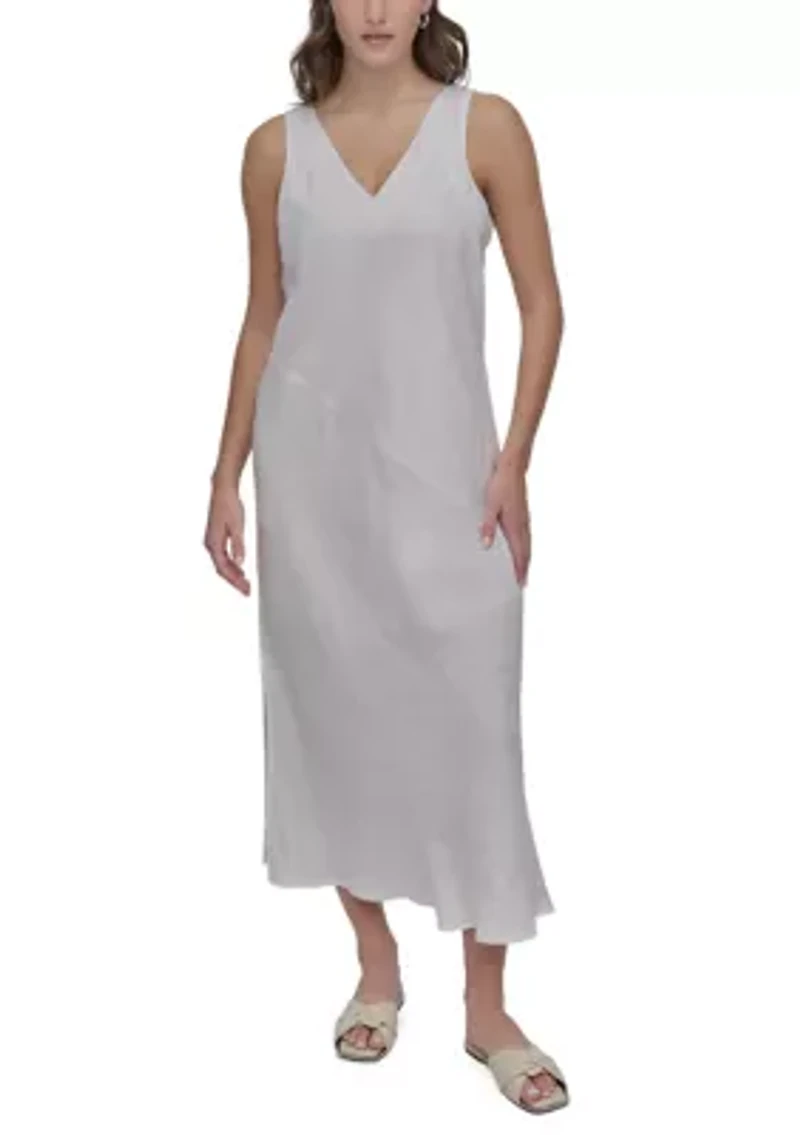 This versatile midi dress from DKNY is crafted from 100% linen, ensuring breathability and comfort all day long. Designed with a flattering V-neckline and pullover style, it effortlessly slips on and off. The sleeveless design provides freedom of movement, making it perfect for casual occasions. Its midi length adds a touch of elegance, while the designer label guarantees impeccable quality. Experience the epitome of comfort and style with this must-have linen midi dress. Pullover V-neck Sleeveless Lined Imported Product Specifications 45" L Material & Care Linen Machine washable