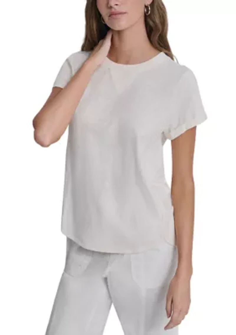 Crafted from a soft cotton blend, this DKNY Sport shirt offers a relaxed fit perfect for everyday wear. The classic crew neck and short sleeves provide a timeless look, while the subtle V-inset adds a touch of charm. Pullover Crew neck Short sleeves Unlined Imported Product Specifications 24.5" L Material & Care Cotton, polyester, spandex Machine washable