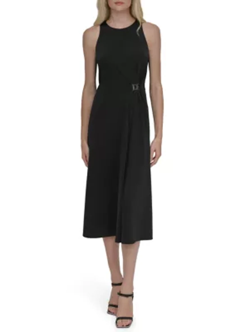 Woven from quality fabric and featured in a sleeveless silhouette, this solid A-line dress from DKNY is updated with a gathered waistline for a modern look. Pullover Crew neck Sleeveless Unlined Imported Product Specifications 48.5" L Material & Care Polyester Dry clean only
