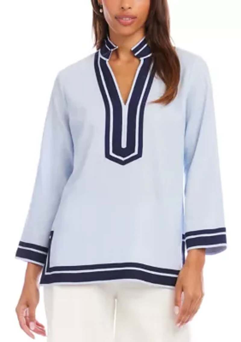 This Karen Kane tunic is effortlessly polished and crafted from a breathable linen-blend woven fabric. Designed with a relaxed silhouette, this lightweight style features a split neckline with contrast trim detailing, long sleeves with coordinating cuff accents and a clean hem for easy, elegant wear. Exposed zip closure Mandarin collar Long sleeves Unlined Imported Product Specifications 27.88" (size medium) Material & Care 55% linen, 45% viscose Hand wash