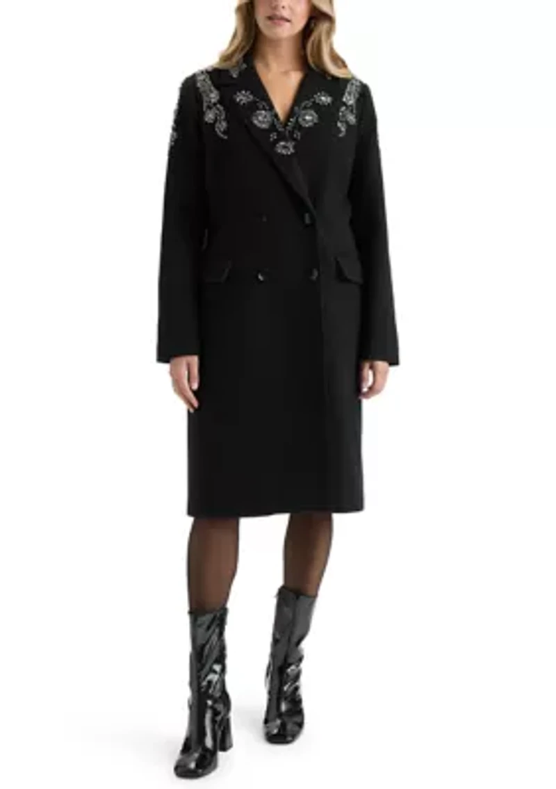 With its sharp tailoring and subtle gem embellishments, this NVLT midi coat brings a refined touch of sparkle to any look. The structured silhouette, complete with a classic notch collar and thoughtful detailing, makes it a standout layer for both everyday elegance and evening polish. Button closure Notch collar Long set-in sleeves Fully lined Imported Product Specifications 40.25" L Material & Care Polyester Dry clean only