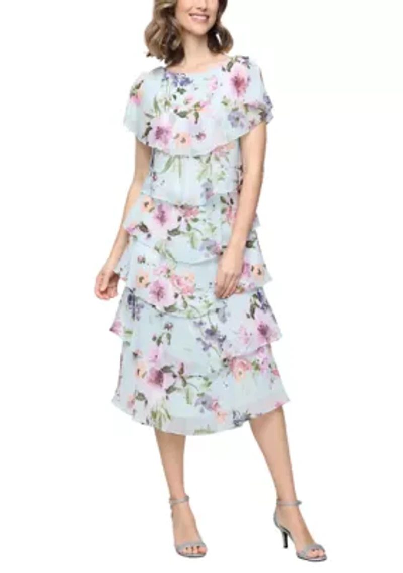 This lovely SLNY dress, with its charming tiered style and beautiful floral print, offers a chic look that's perfect for all-day wear. Pullover Crew neck Short capelet sleeves Imported Product Specifications 48.25" L Material & Care 100% polyester Hand wash