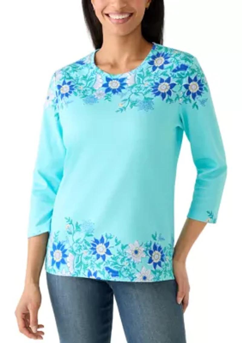This Kim Rogers® top features a stylish print that adds flair to any outfit. Pullover Crew neck Three-quarter sleeves Imported Belk Exclusive Product Specifications 26" L Material & Care 100% cotton Machine washable