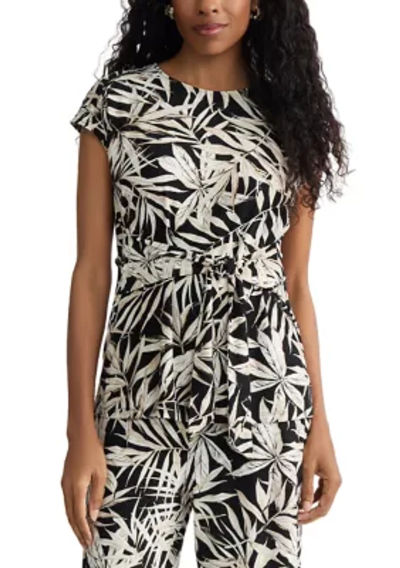 This Kasper top is perfect for any occasion, featuring a charming tie-front design and a stylish print for a chic look all day long. Pullover Crew neck Short cap sleeves Unlined Imported Product Specifications 26" L Material & Care Polyester Machine washable