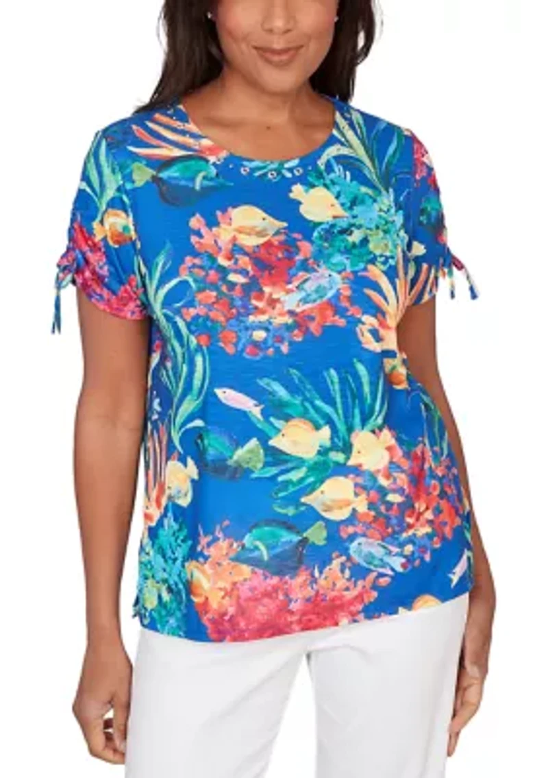 A colorful underwater scene comes to life on this Alfred Dunner tropical reef print shirt. The crew neckline frames the look with ease, while short sleeves are finished with playful side tie ruching for a breezy touch. Pullover Crew neck Short set in sleeves Unlined Imported Product Specifications 24.5" L Material & Care Polyester, spandex Machine washable