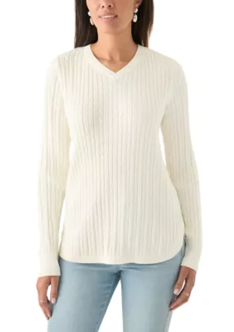 A must-have for the colder days, this soft cable-knit sweater from Kim Rogers® offers cozy comfort. Pullover V-neck Long sleeves Imported Belk Exclusive Product Specifications 27" L Material & Care 100% Cotton Machine washable