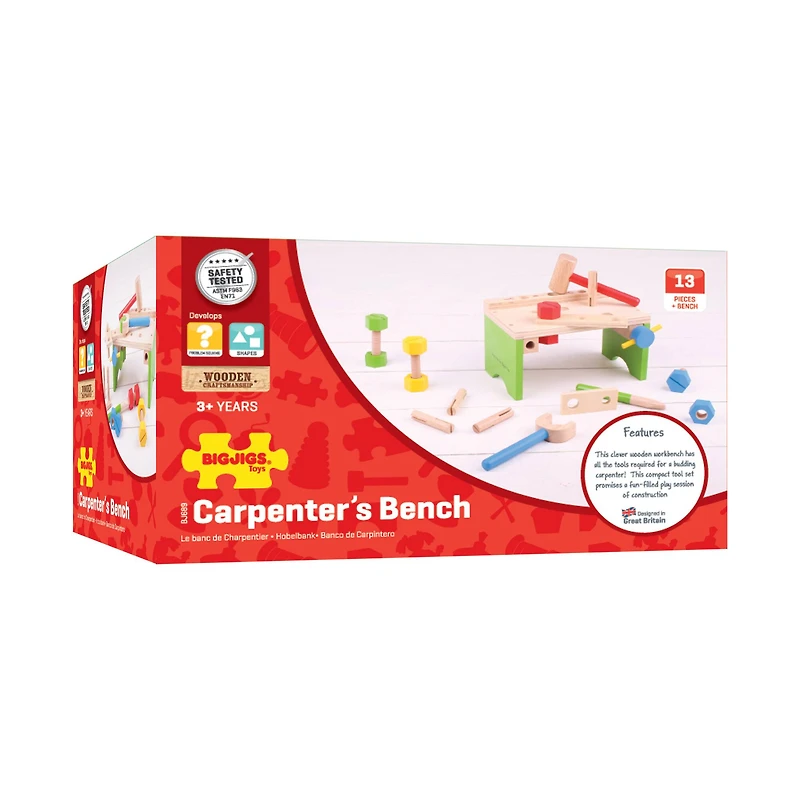 The Wooden Carpenter's Bench will introduce your little one to the joys of working with tools. This set comes with a hammer, spanner, screwdriver and a variety of working nuts and bolts, all made from high quality, responsibly sourced materials. It's great for improving dexterity and hand/eye coordination.Contents include: Wooden Carpenter's Bench, Hammer, Spanner, Screwdriver, 10 Wooden Nuts and Bolts PiecesFor 1 playerAges 3 and upMade in ChinaBrand new condition in original packagingWipe clean with dry or damp clothWarning: Choking Hazard - Contains small parts not suitable for children under 3 years.
