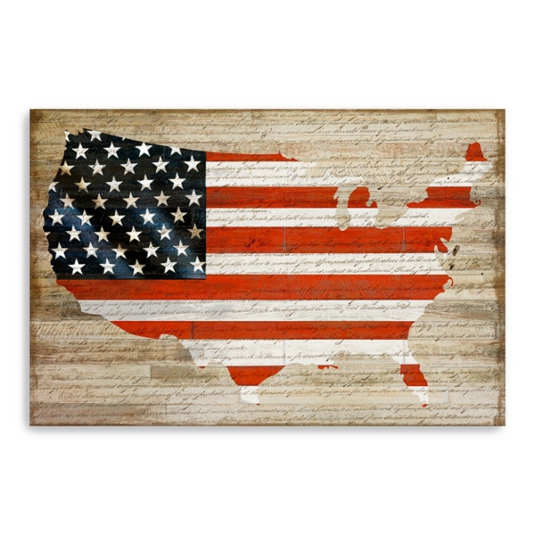 Make any wall in your home look festive and patriotic! Our Woodgrain United States Flag Wall Plaque features a rustic design that’ll look great with your farmhouse décor. Plaque measures 24L x 1.3W x 16H in. Giclee printed on archival-grade, poly-cotton canvas Canvas stretched over solid pine wood Features a map outline of the United States with an American Flag design Accented with a wood slat background and script handwriting details Hues of brown, red, white, and blue Weight: 2.9 lbs. Hangs from back-mounted hardware Care: Dust with soft, dry cloth. Avoid exposure to heat, direct sunlight, and moisture. This item is available at Kirklands.com only, not available in stores. Please note: this item cannot be shipped to APO/FPO addresses.