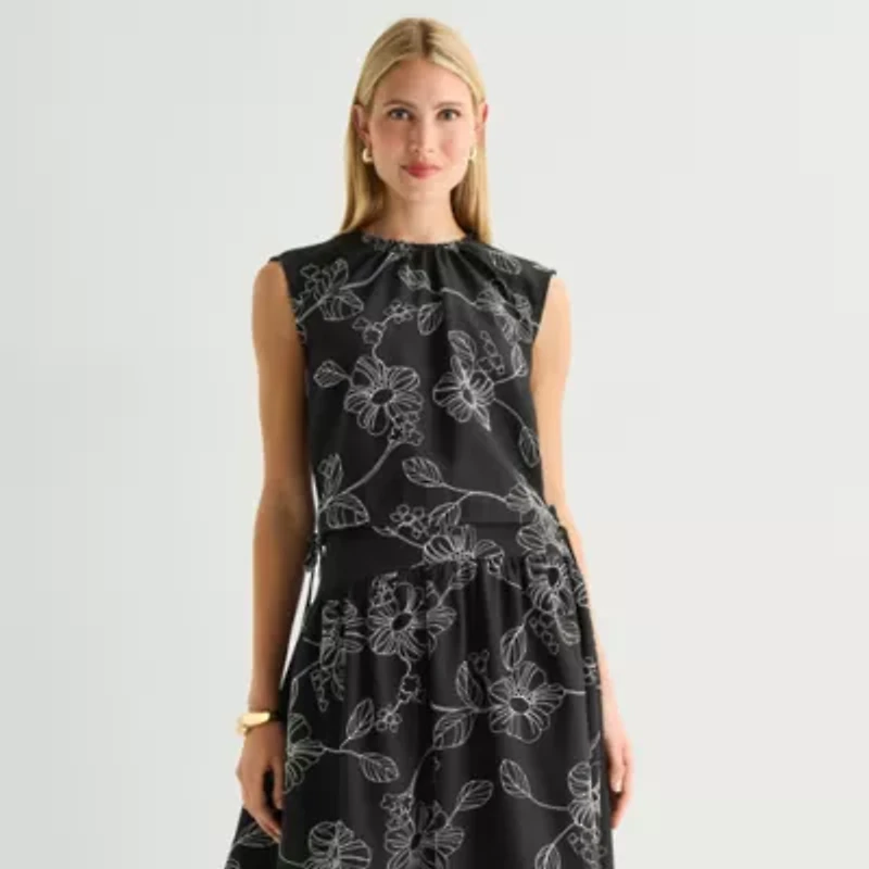 You'll feel chic and on-trend wearing this Worthington women's crop top with other separates on warm-weather days. Made from twill, this sleeveless top has a black and white stylized floral print, a ruched crew neck and tie sides. Wear it with the matching skirt from the collection, capri pants or jeans.
