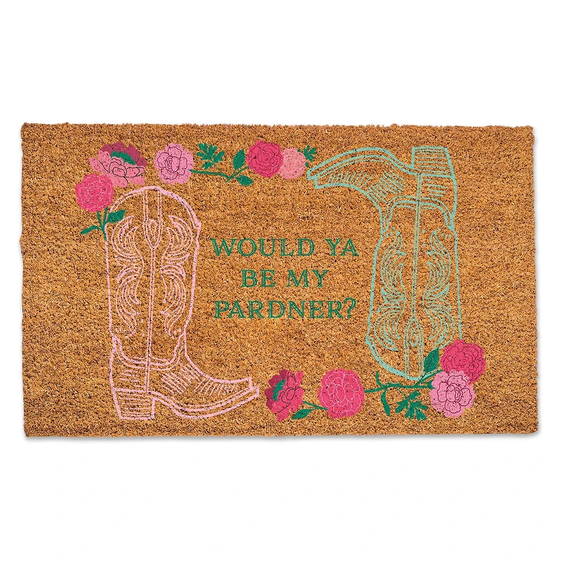 Welcome your guests into your home in style with these doormats that are UV printed on premium quality coir. This mat features a "Would ya be my pardner?" message with cowboy boots and roses.Details:Multicolor print on natural coir30" x 18"