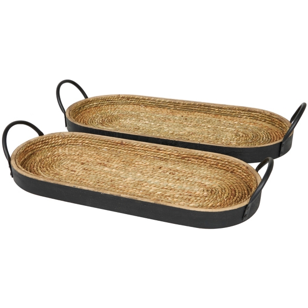 Woven Jute and Black Wood Trays, Set of 2