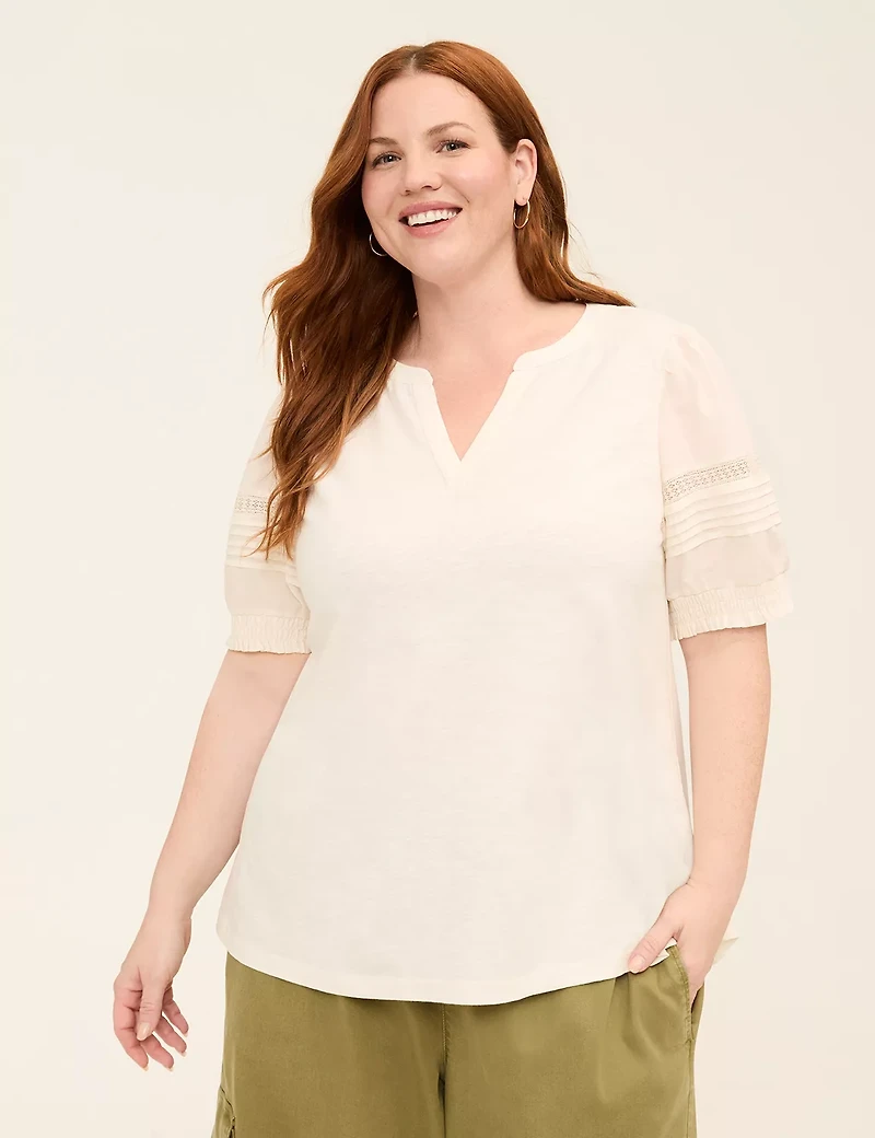 Available in Plus Size A so-soft knit top that looks completely polished whether you're working or weekending. The statement, trim-detail sleeves and trendy notch neck mix-and-match (or pack-and-go) with everything from laidback denim to our 4-season pants. FIT: Classic. Designed for curves and a not-too-tight, not-too-loose, just-right fit. Front Length (On Body): 30" Standard length FEATURES: Notch neck Short puff sleeves with smocked cuffs Trim detail at sleeves FABRIC: Soft, breathable slub knit with smooth woven sleeves Machine Wash 100% Cotton Item Number #411708 Imported Plus Size Top ". Plus Size Woven & Knit Puff-Sleeve Notch-Neck Top, in Cream, 26/28, Women's, Lane Bryant