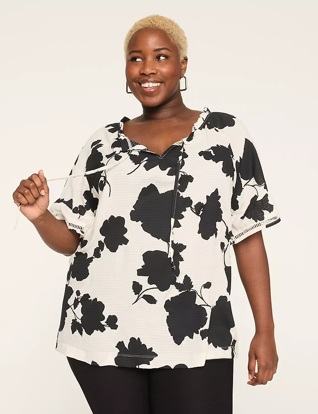 Floral Ruffle Tie Neck Mixed Media Blouse