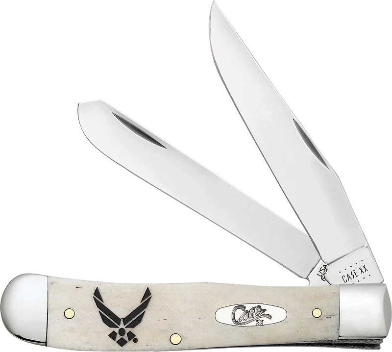 The WR Case & Sons Cutlery Co US Air Force Trapper features a pair of blades made from Case Tru-Sharp™ stainless steel, which resists corrosion and keeps a point longer than other steel. The Clip blade is ideal for detail work, while the Spey blade provides excellent utility. The two jackknives share a natural bone handle patriotically adorned to honor the US Air Force.