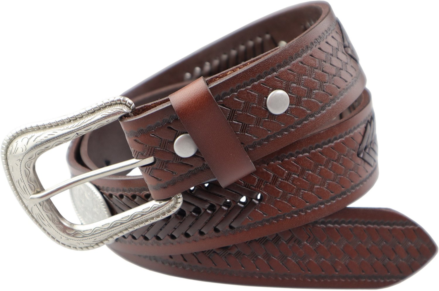 Durability meets style with the Wrangler Men's 38mm Top Lace Basket Weave Concho Belt. This concho-style belt is made with high-quality tanned leather that is built to last, and the top lace basket weave adds classic style.