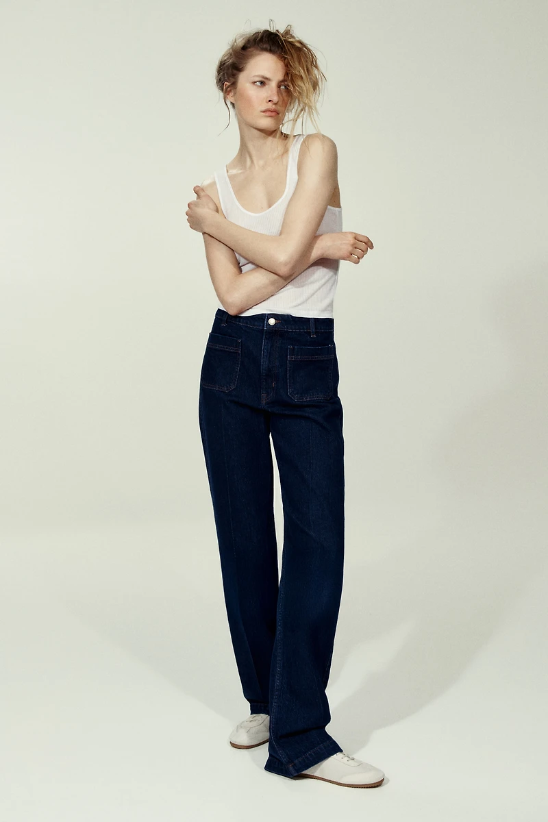 Jeans in cotton denim with gentle stretch for good comfort. Regular fit from waist to hip and wide cut from thigh to hem. High waist, zip fly with button, patch front pockets, and patch back pockets. Creases at front and back. Wide, regular-length legs, designed to fall at top of foot with little or no stacking. Effortlessly flattering no matter how they're styled.