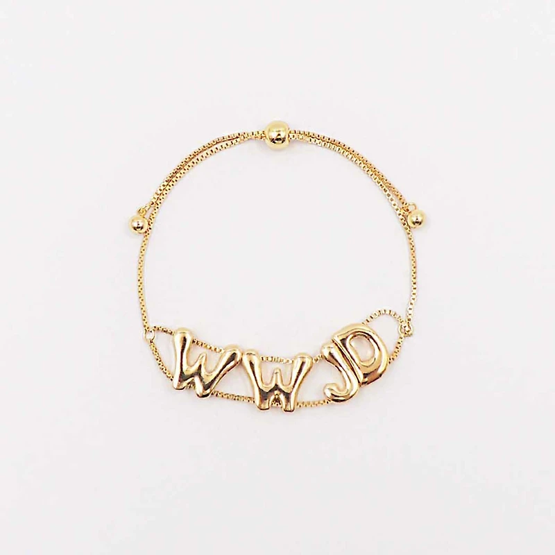 Carry a message of faith and inspiration wherever you go with this Gold WWJD Bracelet. Crafted with a sleek adjustable chain and bold gold-tone lettering that reads “WWJD,” this bracelet adds a meaningful touch to your everyday look. Its minimalist design layers beautifully with other pieces or shines on its own as a statement of purpose and positivity.